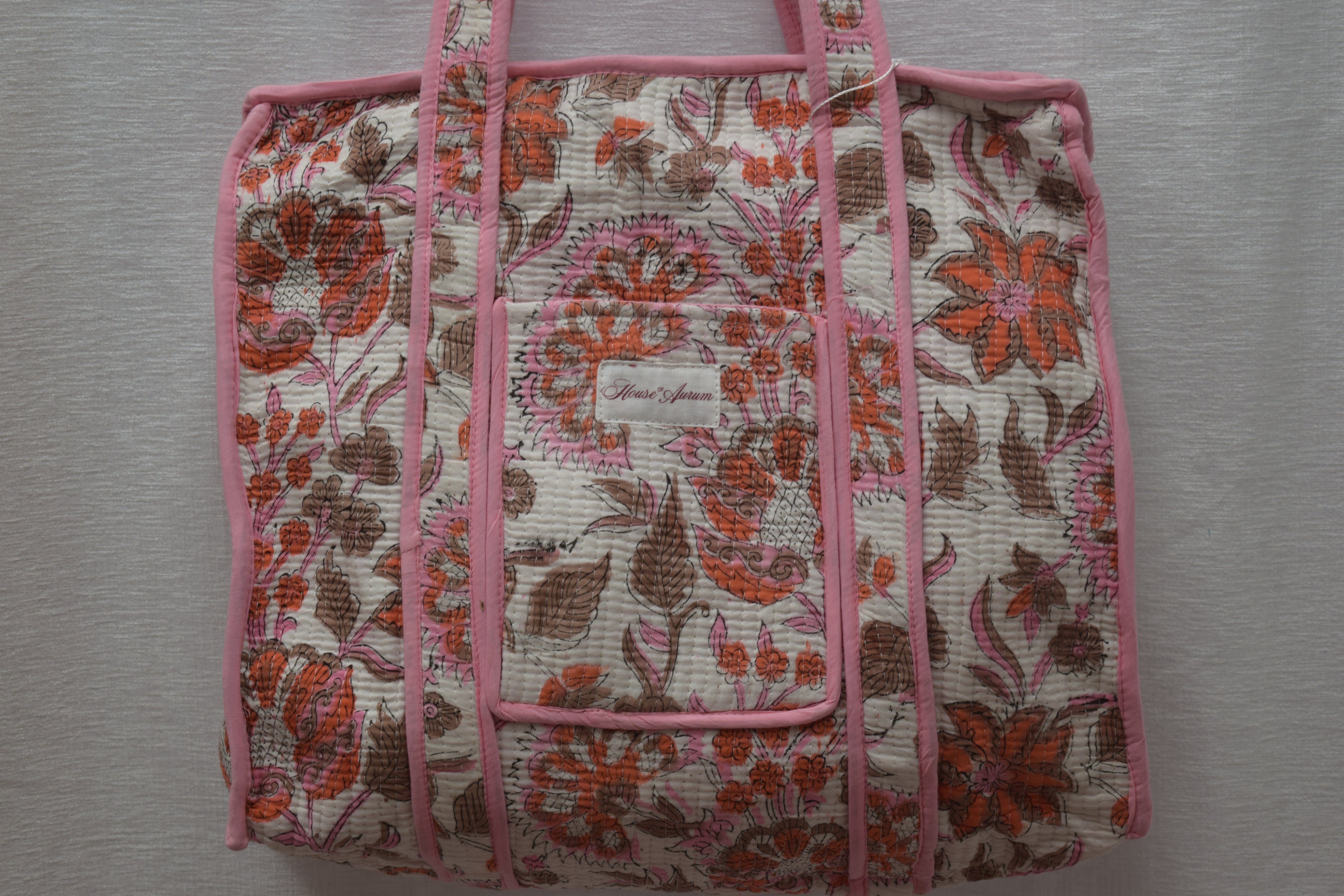 BEIGE ORANGE PINK FLORAL TOTE