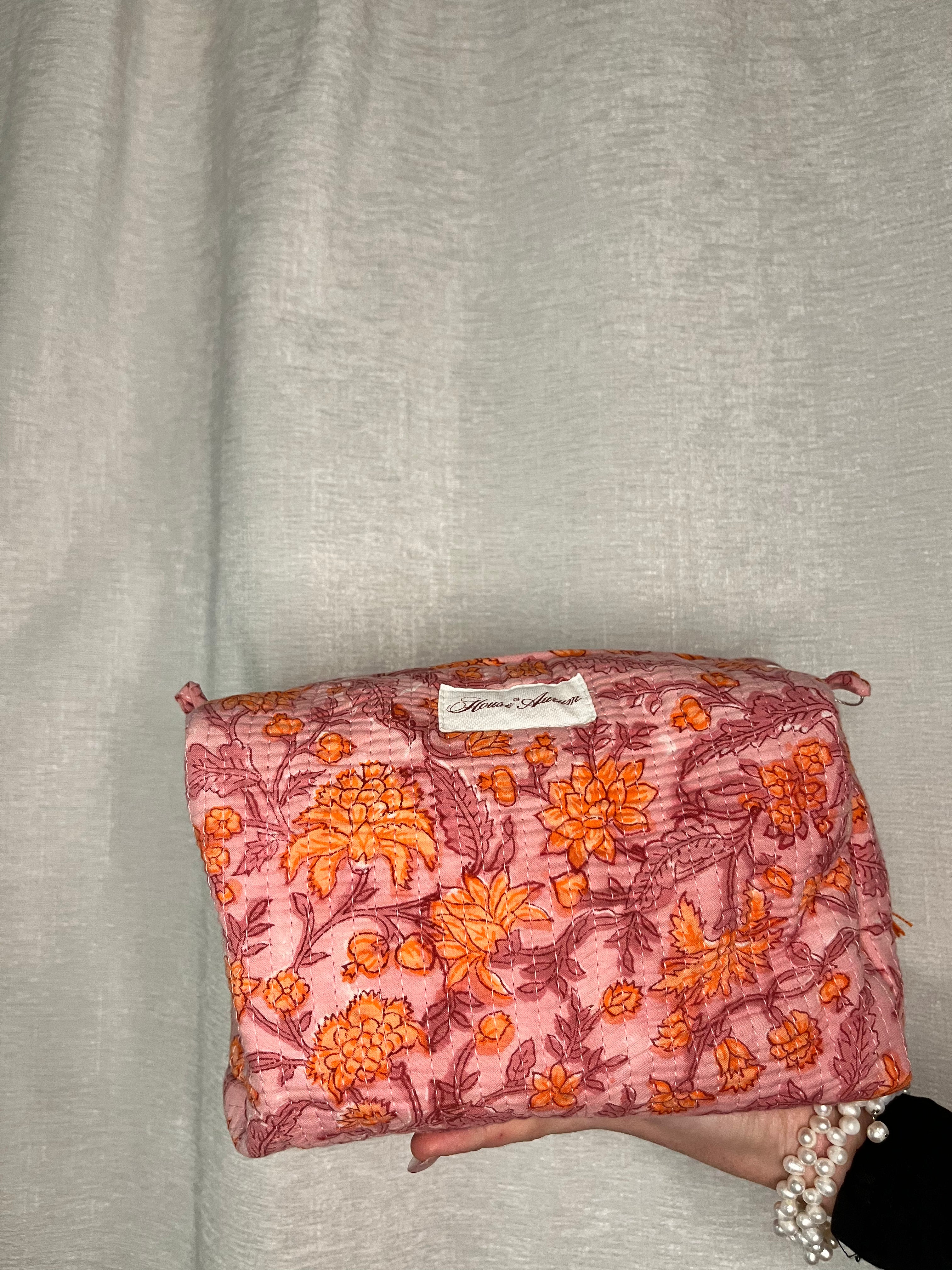 The pouch you didn’t know you needed (but definitely do). Two Sizes. Double-lined in a waterproof, wipable interior and hand-block printed exterior, these are ideal for makeup, skincare, or mom-on-the-go essentials. Artisan made in tiny quantities—so grab yours while they last.