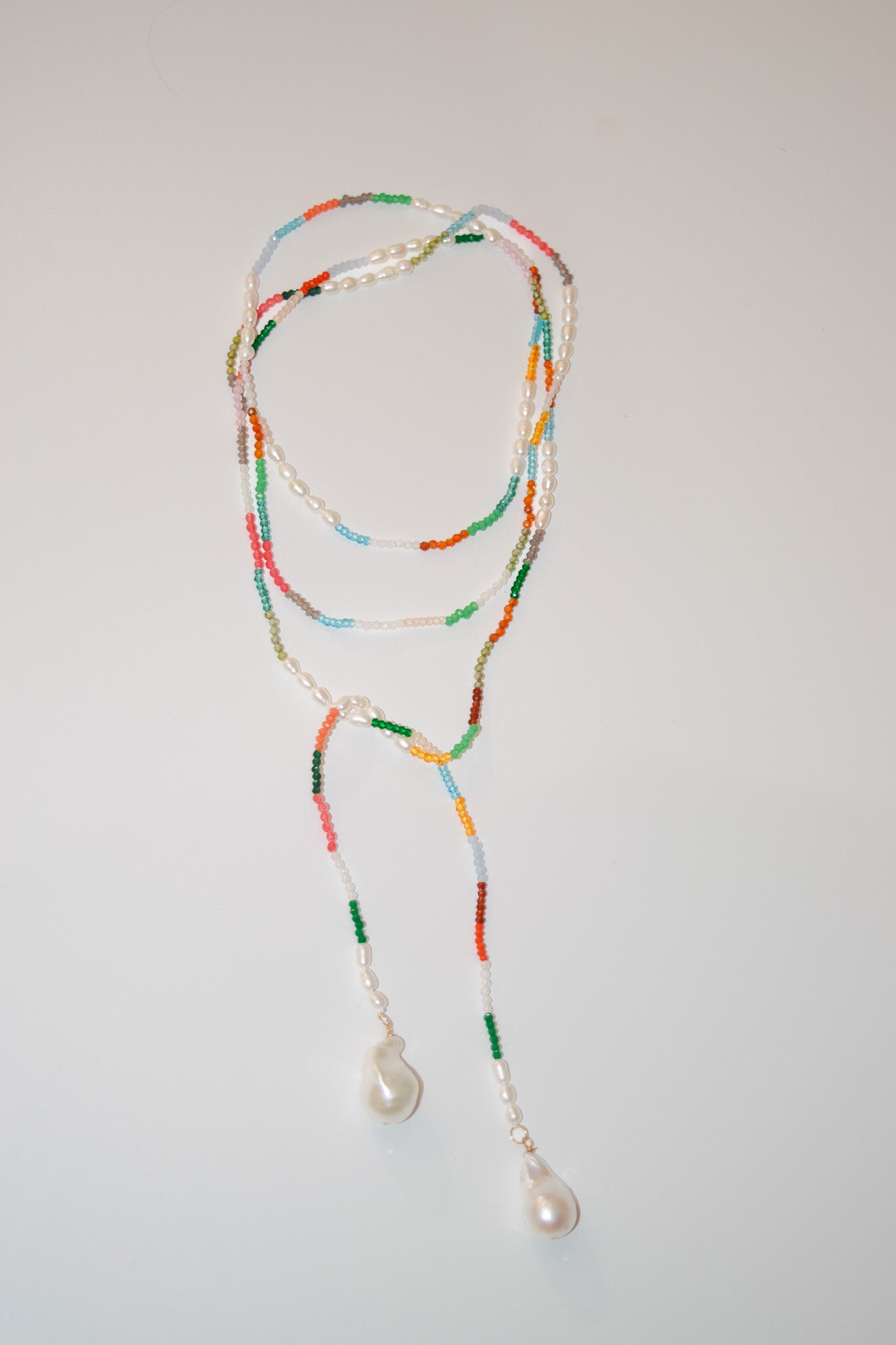 This multi-strand gemstone necklace is hand-strung with a vibrant mix of natural stones, designed to wrap and style in multiple ways. Wear it layered around the neck, wrapped as a choker and drop, or styled long for a more relaxed, bohemian feel.